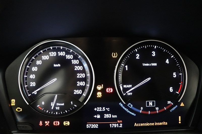 ABS con ripartitore elettronico della forza frenante , Airbag frontali e laterali per guidatore e passeggero , Airbag per la testa a tendina ant. e post. (Window-bag) , Appoggiatesta posteriori , Assistenza alla frenata di emergenza , Autoradio touchscreen 6.5” con ingresso USB, Bluetooth Streaming e comandi al volante , BMW Connected Drive Services [6AK] , BMW Emergency call [6AC] , BMW Remote Services (controllo remoto della vettura) [6AP] , BMW TeleServices [6AE] , Bracciolo anteriore e posteriore , Cambio manuale a 6 rapporti , Cerchi in lega da 16” , Chiusura centralizzata , Climatizzatore automatico monozona con microfiltro [534] , Computer di bordo: vel. media, consumi medi, autonomia, indicatore di temp. esterna , Controller iDrive nella consolle centrale con tasti per selezione diretta funzioni , Controllo dinamico della trazione (DTC) , Controllo dinamico di stabilit� (DSC) , Correttore assetto fari , Cruise Control , Disattivazione airbag passeggero anteriore [5DA] , Fari Fendinebbia LED , Filtro antiparticolato , Freno di stazionamento elettronico , Guida uso e manutenzione integrata e accessibile via Control Display , Immobilizzatore , Indicatore di pressione pneumatici (RDC) [2VB] , Luci di stop con lampeggio in caso di frenata di emergenza , Navigatore satellitare , Proiettori anteriori alogeni con luci diurne LED , Rivestimento sedili in tessuto , Sedili anteriori del guidatore e del passeggero regolabili manualmente con supporto lombare regolabile elettronicamente [450] , Sedili post. a 3 posti abbattibili con rapporto 40:20:40 e attacchi Isofix per i sedili esterni , Selettore del feeling di guida (con modalit� Eco PRO, Comfort, Sport) , Sensore luci e pioggia [521] , Servotronic: servosterzo elettrico ad assistenza variabile [216] , Sistema di monitoraggio per manutenzione , Specchietti retrovisori esterni regolabili e riscaldabili elettricamente con indicatori di direzione integrati , Start&Stop , Terminale di scarico singolo cromato , Vetri elettrici anteriori e posteriori , Volante in pelle a tre razze regolabile in altezza e profondit� , Cristalli posteriori oscurati , Serbatoio aggiuntivo AdBlue , Kit Fix&Go.